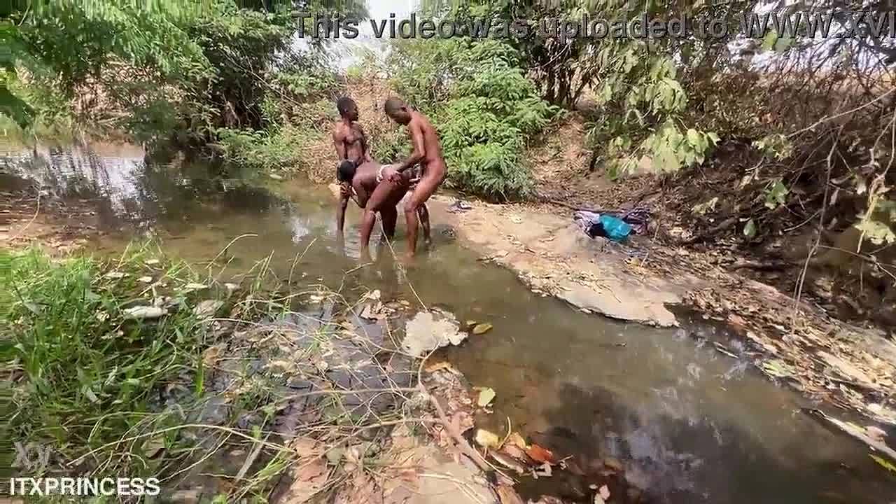 Petite teen got stuck and freeused by a group in the forest.
