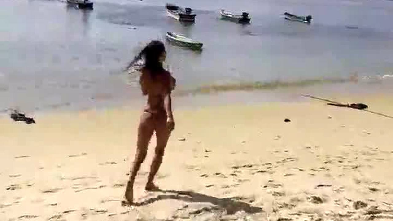 Angela, ebony latina with huge ass and big tits, caught on beach by white guy with pink cock