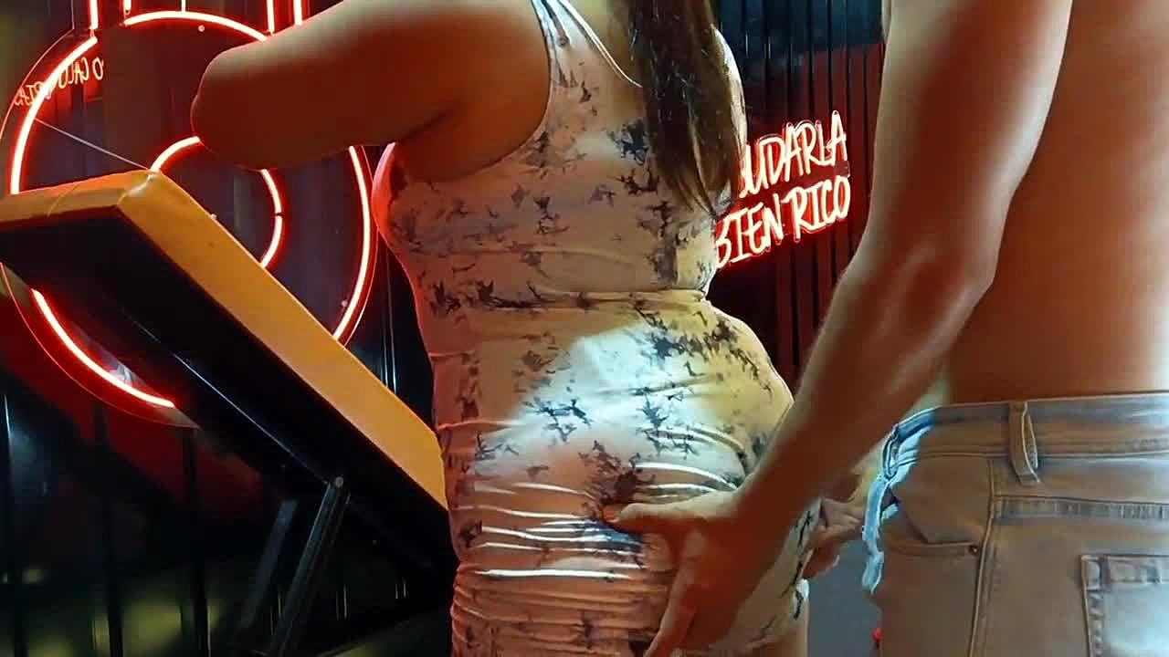 Big Ass Brunette Walks Outdoors in Butt-Less Jeans