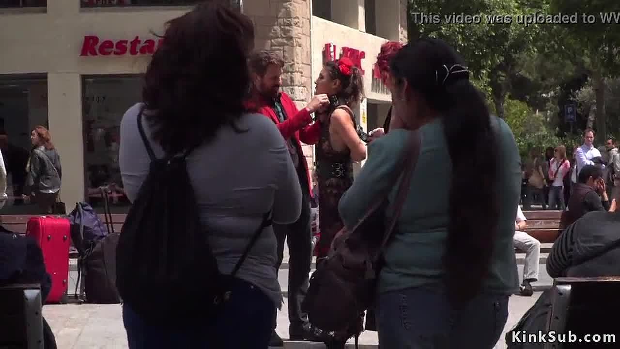 Bound beauty cattle prodded in public for kinky thrill. Shocking outdoor disgrace!